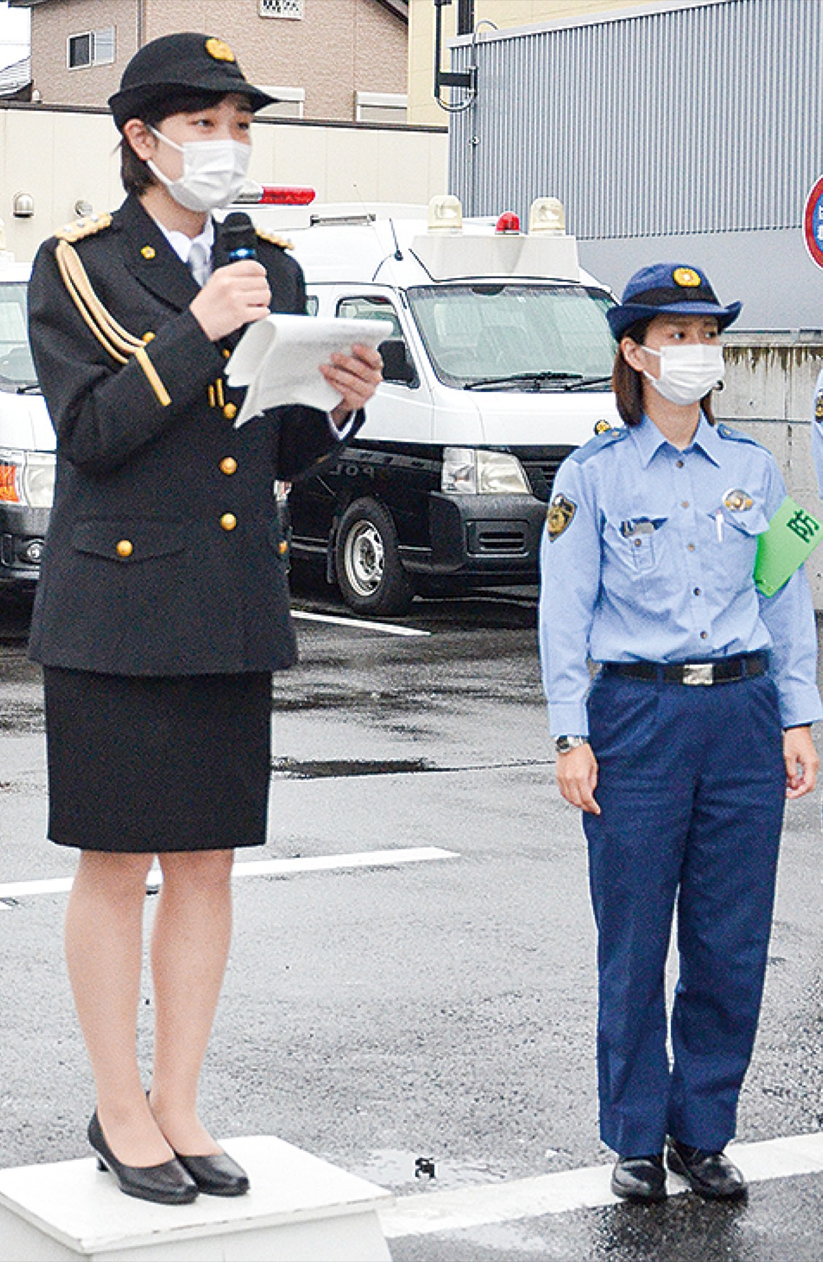 2人の一日署長は、講堂に集まる関係団体の会員らの前で「地域の安全を守ります」と安全安心を宣言。その後、佐藤さんは駐車場で青パトの出発を指揮し、集まった青パトが一斉に地域のパトロールへ向かった。