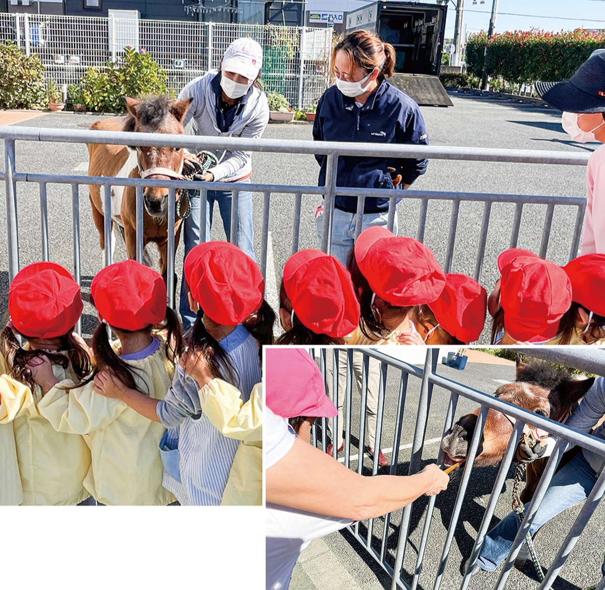 当日は、同法人が運営する妻田保育園(妻田西)と翼咲(つばさ)保育園(妻田南)の年長園児も参加。柵越しにポニーに近づき見学。ポニーに関するクイズや質問コーナーも楽しんだ。また、スライスした人参を直接あげる体験も。