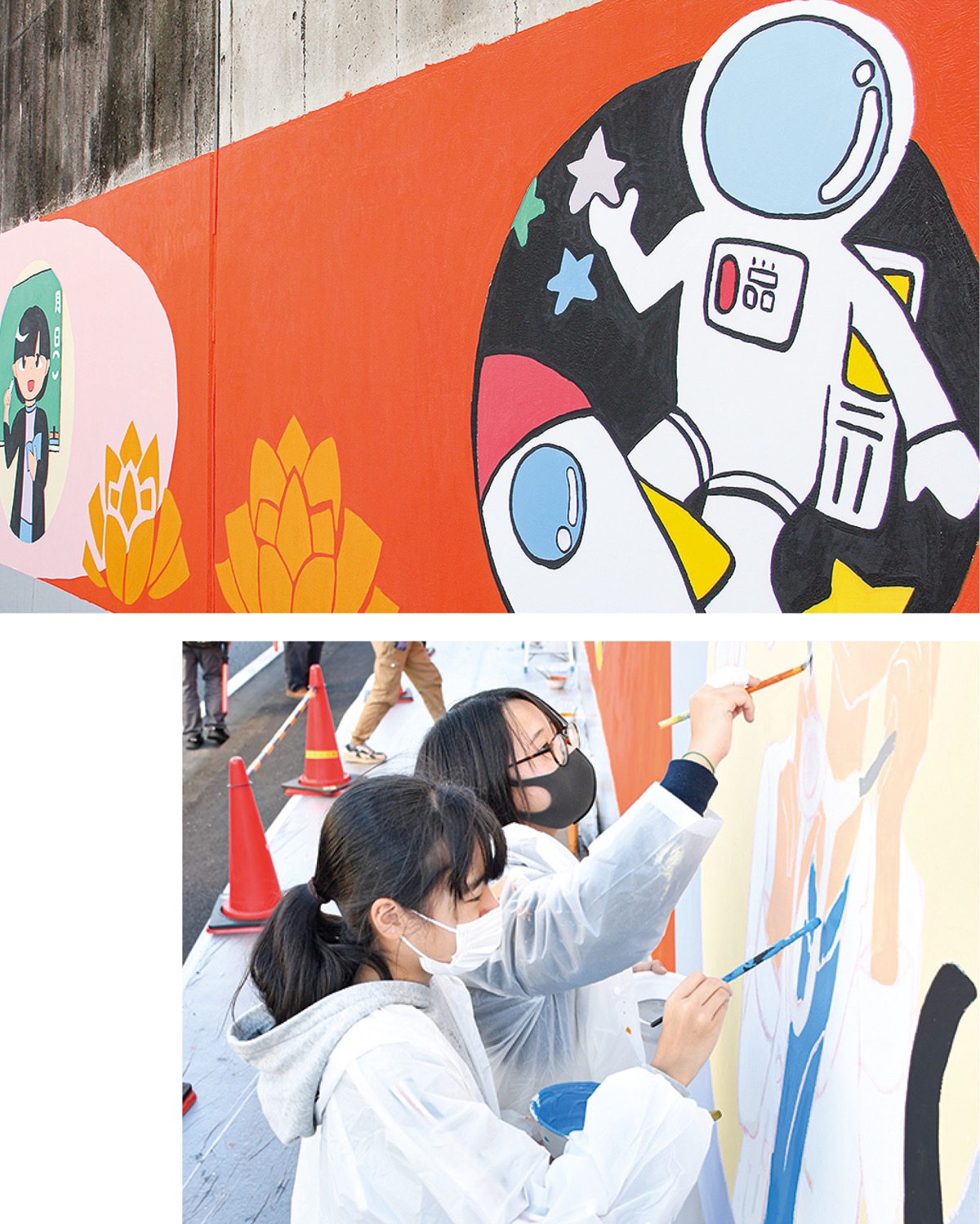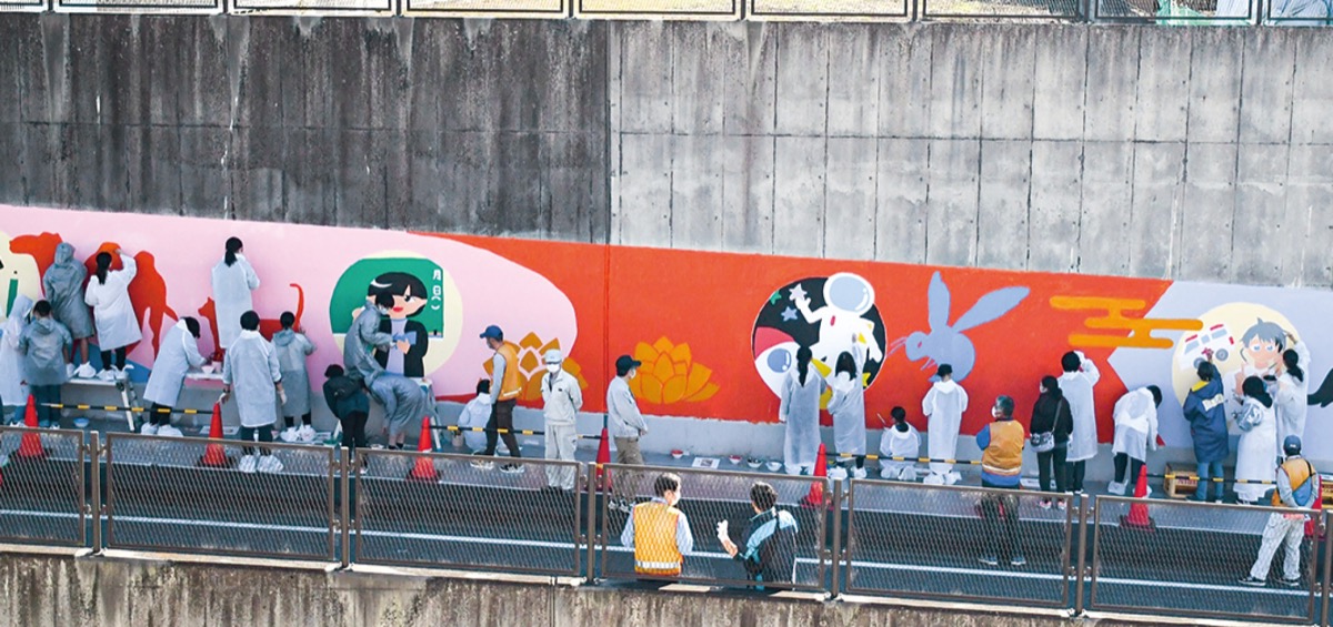 11月13日の壁画制作には、同会をはじめ、地元自治会、依知中学校の生徒・教職員ら90人が参加。壁画のデザインは依知・依知南小の3年生児童が「将来の夢」をテーマに描いた絵をもとに依知中美術部が原画を考えた。1日かけて作業は終了。参加した依知中の明松由唯さんは「壁画を描いたのは初めて。このような活動で落書きが無くなってほしい」と話す。また同会の星野一郎会長は「今後も地域で協力して壁画を増やしていきたい」と話した。