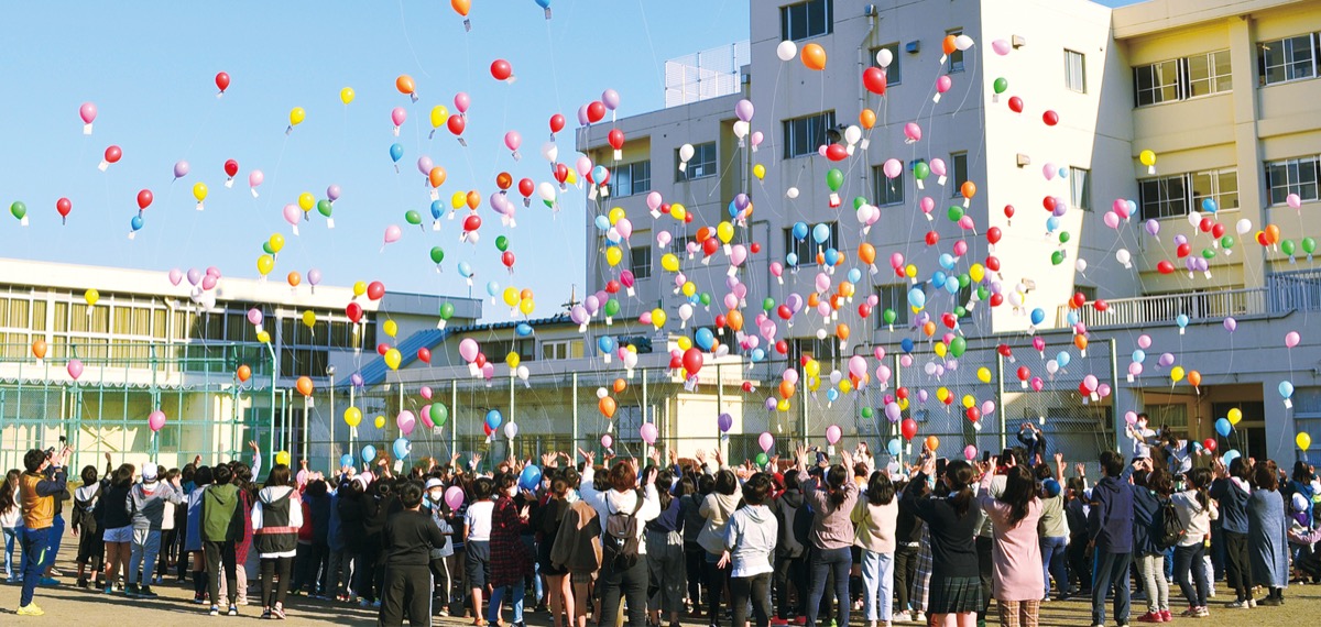 校庭では、節目を記念して人文字が作られ、上空からドローン(無人航空機)による撮影が行われた。また、環境に負荷をかけない自然に分解される風船が用意され、児童らが将来の夢を書いた手紙を付けて一斉に大空に飛ばした=写真。同校の中村慎輔校長は「地域の方にご協力をいただいて40周年を迎えることができました。子ども達にとって良い思い出になったら」と話した。