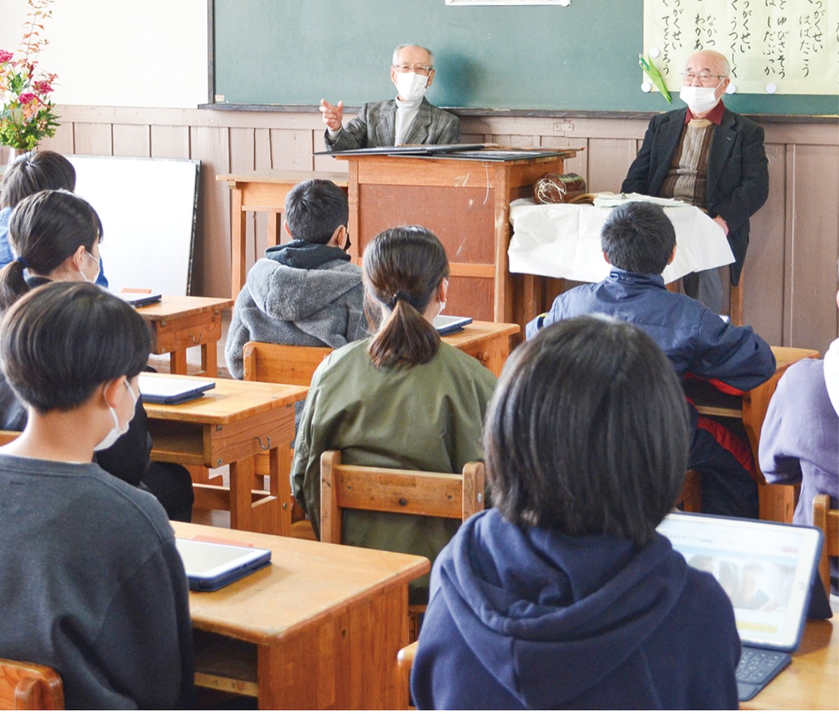 この日は、同校6年生児童40人が参加した。講師として、同校の卒業生で地域に住む笹生竹治さんと小島和三郎さんが来校。授業は質問形式で行われた。