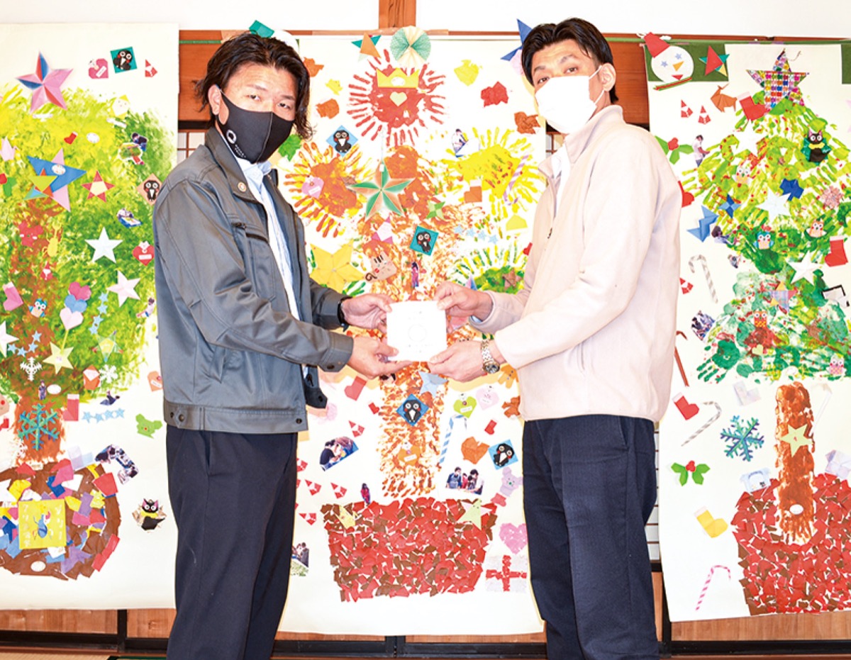 同事業はコロナ禍の奉仕活動の在り方を考えるきっかけとして今年10月に開かれたもの。同施設にクリスマスツリーのアート作品を贈るとして、厚木JC関係者や地元大学生が参加。DVDには、作品づくりに取り組む様子の写真がスライド形式で収められており、厚木JCの大塚慶之さんが同ホームの近藤俊輔施設長に手渡した。