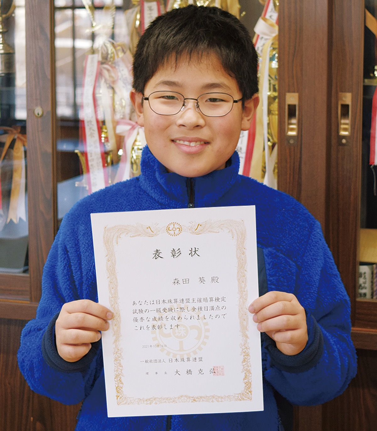 厚木市上依知の森田そろばん塾に通う森田葵(まもる)さん(上依知小5年)が、昨年10月に行われた日本珠算連盟主催による暗算検定試験の一級で、全種目満点合格を達成した。