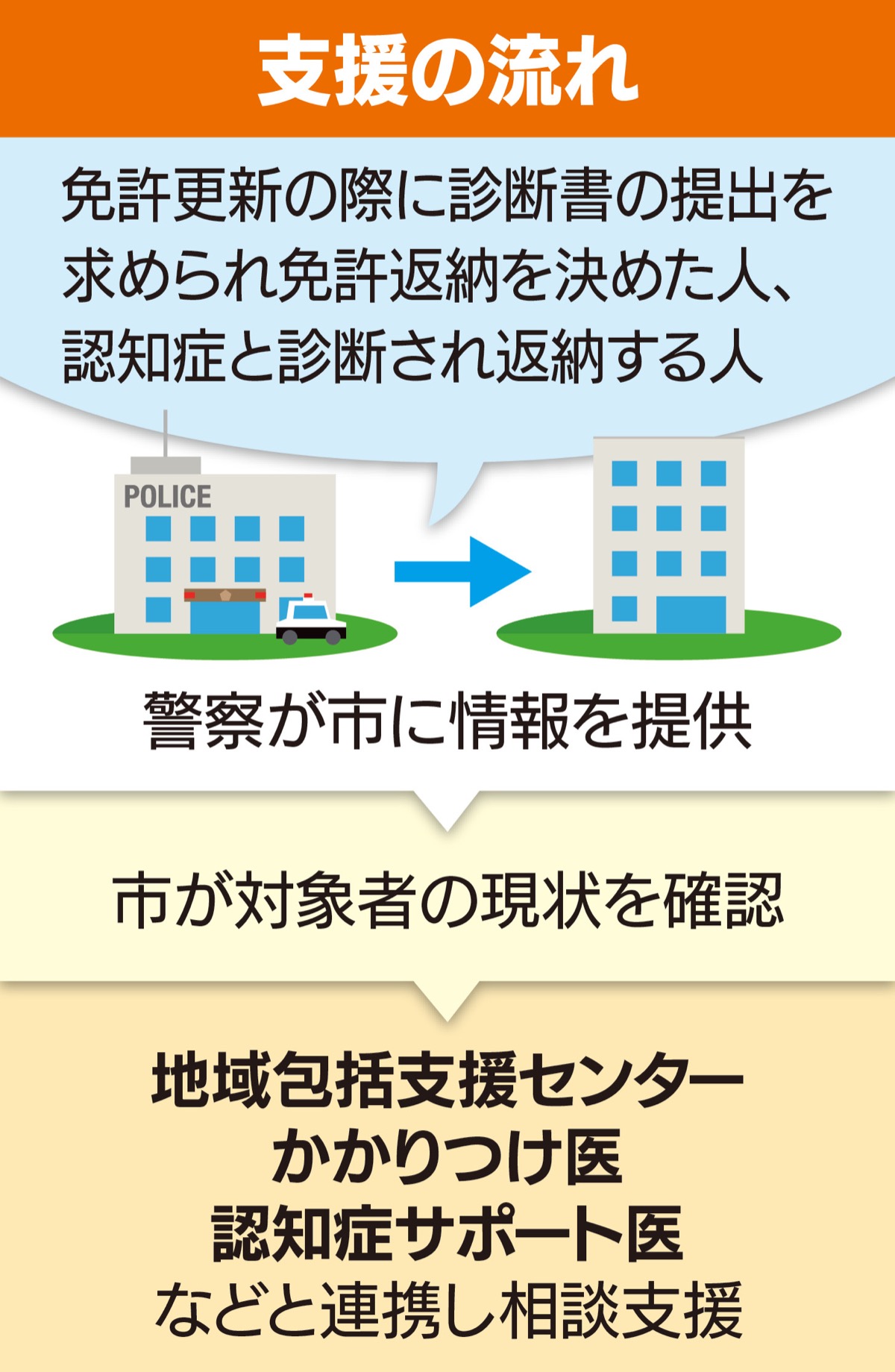 今回の協定内容は、認知症、もしくは認知症の疑いがあって運転免許を返納した高齢者に、返納後の心や身体に関する相談や支援を市と、警察が連携して行うというもの。対象は、75歳以上で免許更新の際に、認知機能検査で診断書の提出を求められ、免許返納を決めた人、認知症のため免許を返納した人。同意を得た上で、その情報を警察が市に提供し、市は対象者の現状を確認。適切な対処につなげる。