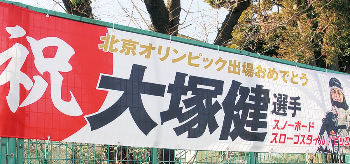 オリンピック出場を受け、地元飯山も盛り上がる。母・朋美さんの友人や地元有志が集まり、横断幕を作成。飯山地区を中心に掲示された。「地域の応援は本当にありがたい。ケガをしないで無事に帰ってきてほしい」と朋美さん。大塚さんは「飯山は小さいころから住んでいて、帰ってくると落ち着く場所。応援に応える滑り、最大の事をしてメダルが取れれば」と話した。