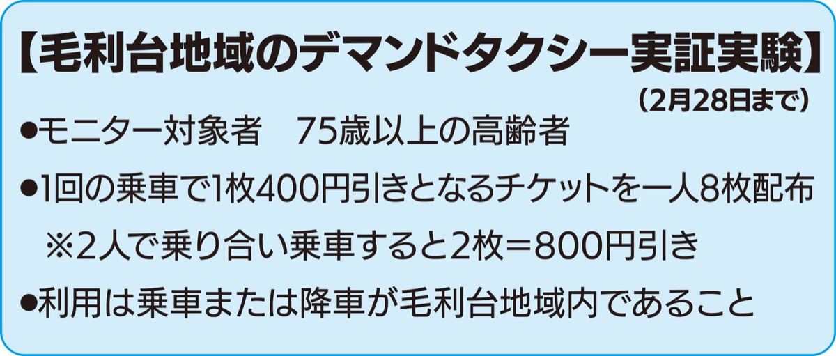 利用時間は午前9時から午後4時までで、乗車か降車のどちらかが毛利台地域内である必要がある。なお、乗り合いで2人乗車する場合はチケットが2枚使用できるため、800円引きとなる。市ではコミュニティ交通導入検討事業費として今年度269万4千円の予算を計上している。