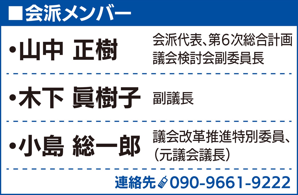 私たちは、議決機関としての議会の機能と、積極的に政策提言をする議員・会派の機能を一層深めていこうという考えで結成されました。どうぞ宜しくお願い致します。