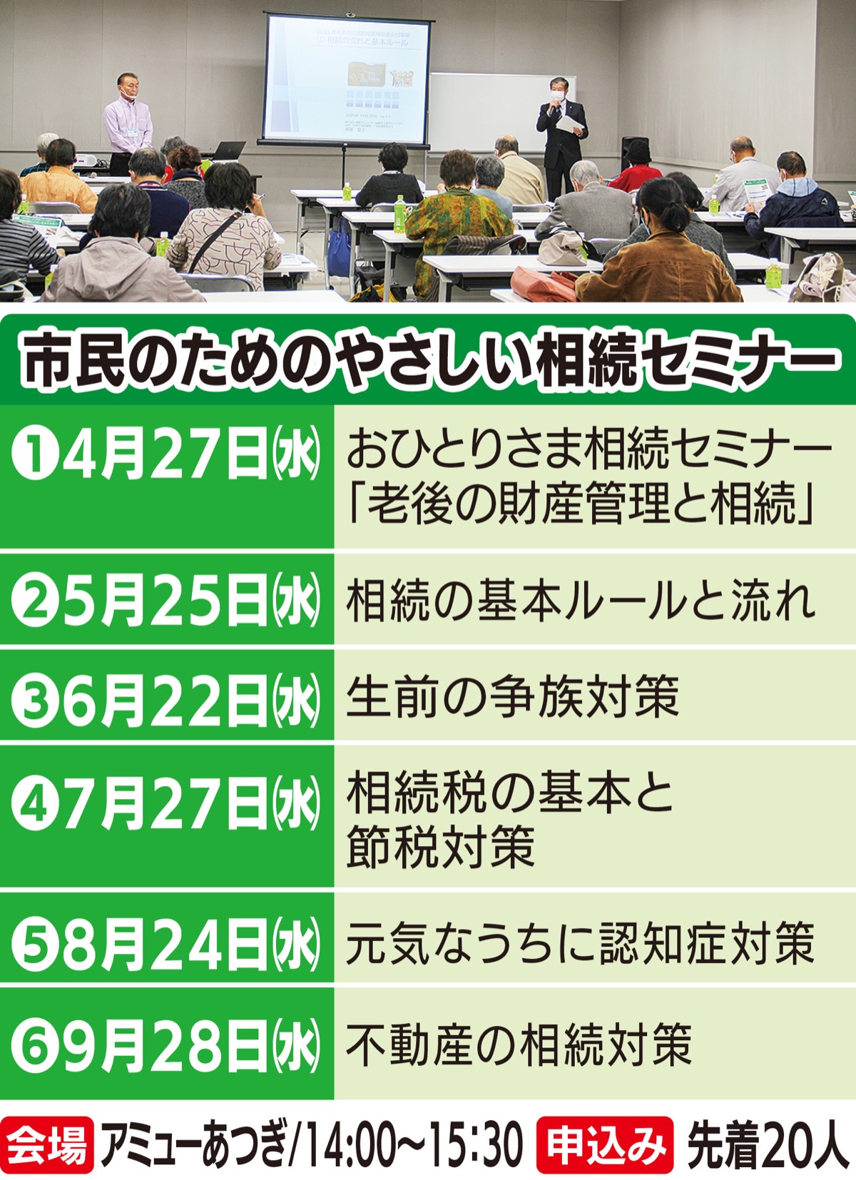 NPO法人相続アドバイザー協議会認定会員の須藤盛士氏と能勢健一氏、司法書士の中野智子氏が、相続の基本から老後の財産管理、認知症や相続対策を解説してくれる。会場はアミューあつぎの市民交流プラザ。終了後2組まで弁護士・司法書士・税理士・行政書士の無料個別相談もある。相続は知識が重要。この機会に勉強しては。
