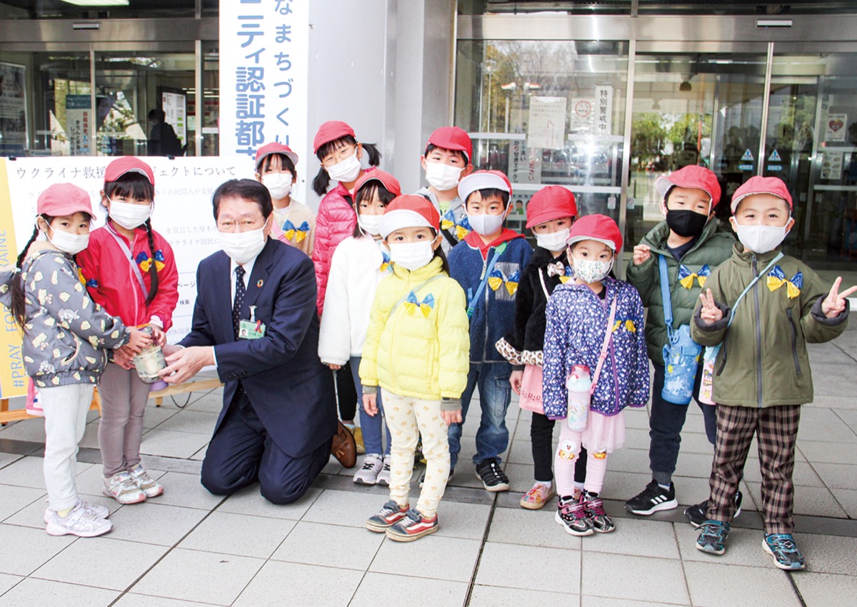 「ウクライナの子たちが安心できるようになってほしい」と年長児の阿部祥子さん。小林市長は「ウクライナを応援する募金をありがとうございます。責任を持って皆さんの気持ちを届けます」と話した。