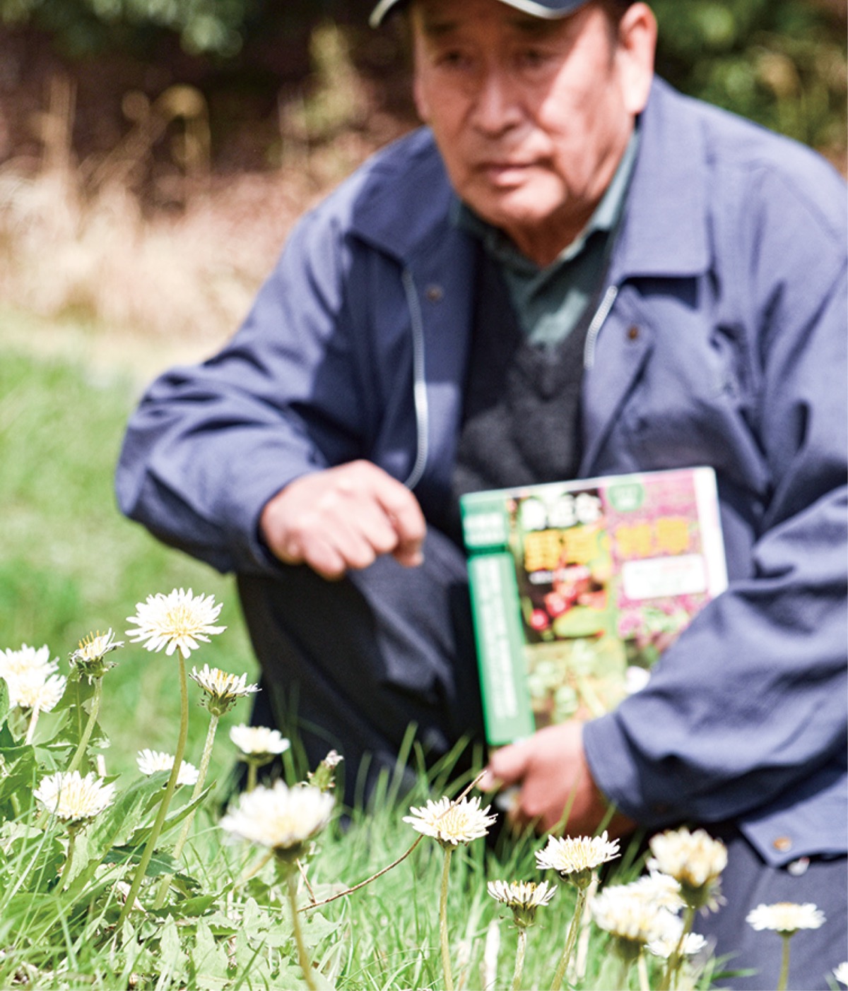 「シロバナタンポポだと思います。関東ではあまり咲いてないですね」。植物図鑑を開く近藤正男さん(78歳・三田在住)は、この場所に咲くのを10年以上前から見守ってきた。