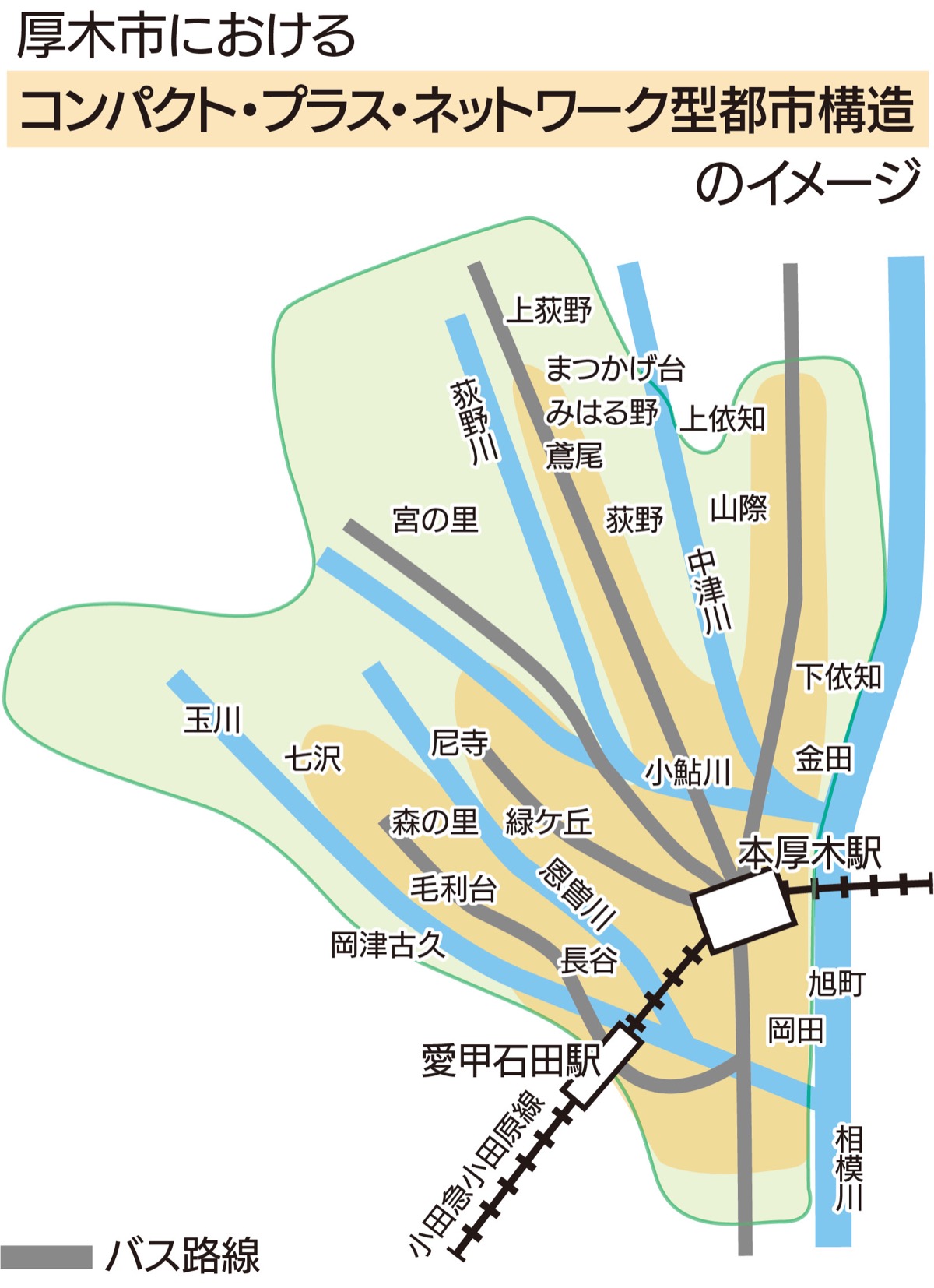 厚木市は、居住と医療施設や商業施設をバス路線沿線に緩やかに誘導する、コンパクト・プラス・ネットワーク推進事業を昨年度に引き続いて取り組み、事業の拡充も図る。人口の減少と高齢化による、生活の不便や町の活気の喪失を防ぎ、市民の暮らしやすさを守ることがねらい。