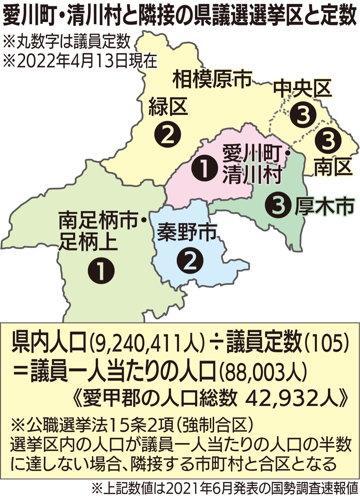 昨年6月に発表された2020年の国勢調査の速報値によれば、県内の人口は924万411人。これを議員定数の105人で割った議員1人当たりの人口は8万8003人で、再編の対象となった愛川町・清川村はこの人口の半数となる4万4001人を下回った。公職選挙法15条2項では、選挙区の人口が県内人口を議員定数で割った「議員1人当たりの人口」の半数に達しない場合、隣接する市町村の区域とあわせて1選挙区を設けると定められており、県議会は議員定数等検討員会を設置し協議を重ねてきた。