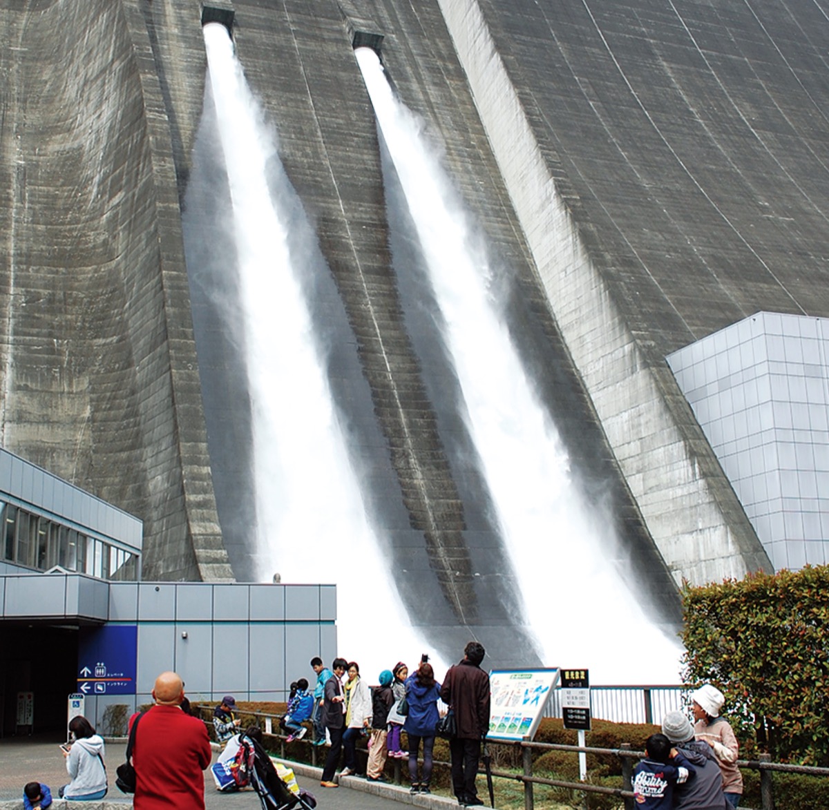 多くの人が訪れる宮ヶ瀬ダムの観光放流。人気の理由はその迫力にある。2つの放流管から流れ出る水の量は毎秒30㎥で、高低差70mのダイナミックな人工瀑布は圧巻だ。相模川水系広域ダム管理事務所によると、観光放流の水は同ダム下流の石小屋ダムに貯められるので水を無駄にしているわけではないという。