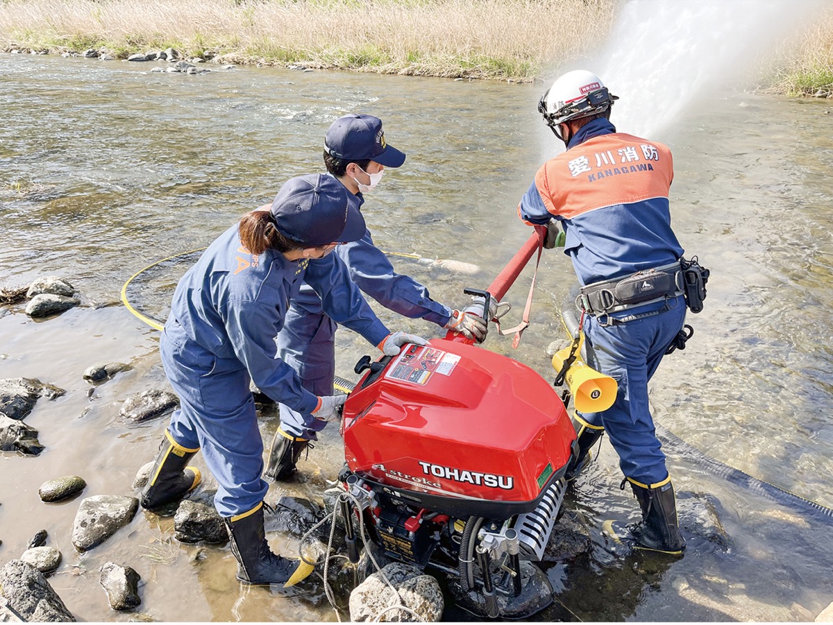 訓練には75人の消防団員が参加した。訓練場に設けられた緊急用のコースで火災現場までの安全管理や防火水槽に消防車を近づけ水をくみ上げる一連の流れを確認した。また、中津川河川敷では小型動力ポンプの基本的な動作確認や放水を行うなど多様な訓練で技術を磨いた。