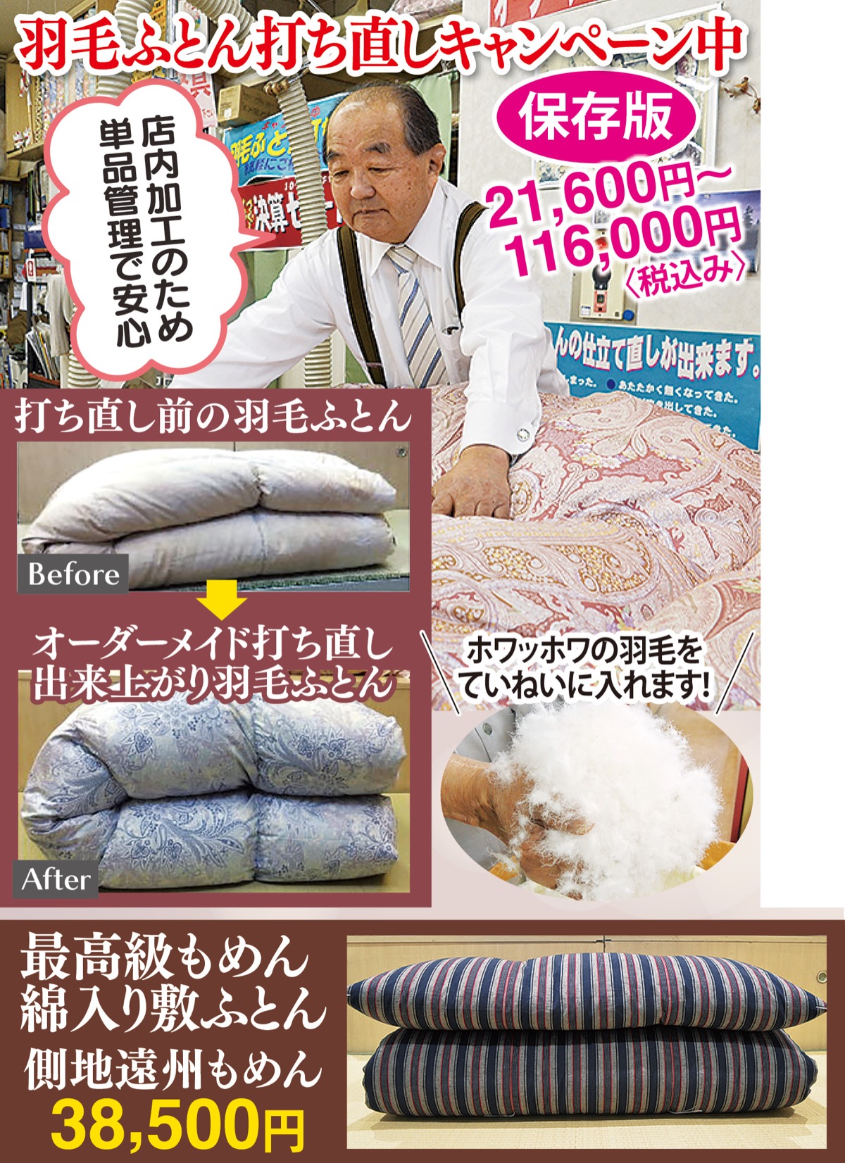 人気商品のオーダーメイド羽毛ふとん、ウール敷ふとん、木綿わたふとん、正反発のボディドクターマットレス、各種カバーシーツ、今治タオル等がセールな上、『眠りの質を上げる』羽毛ふとんの打ち直しもキャンペーン中。木綿・羊毛ふとんの打ち直しも受付中。集配は無料。