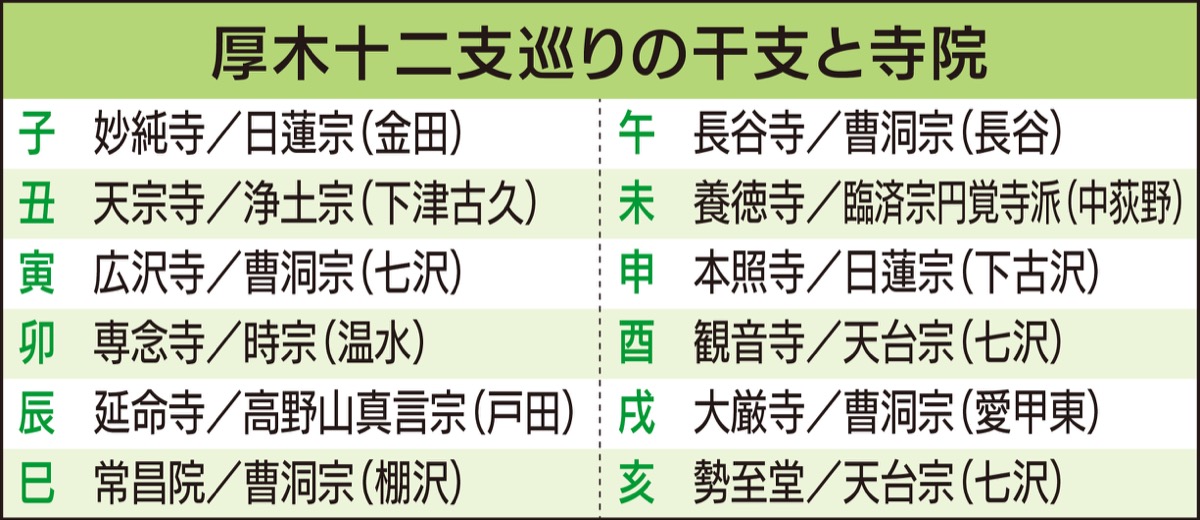 この十二支巡りを企画したのは、厚木市内の寺院有志からなる厚木巡礼史跡文化の会(加藤英宗会長/長谷寺住職)。寺院にもっと親しみを持ってもらおうと、2021年12月から専用の御朱印帳の販売をスタート。賛同した11寺院・12カ所を自分のペースで巡り、御朱印を集める。期間や順番は自由で、気軽に参加できる企画だけに開始から人気を集めている。