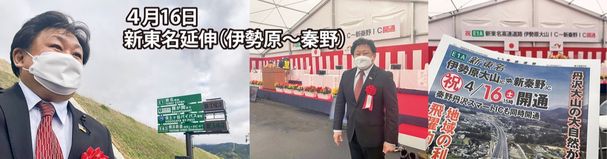 新東名伊勢原大山〜新秦野ICが開通しました。3年前挑戦した厚木市長選挙公約の一つが「厚木市の慢性的な渋滞解消」でした。県会議員としての11年間も厚木秦野道路(国道246号バイパス)整備は「市民の悲願」と県議会本会議や委員会で多く取上げてきました。