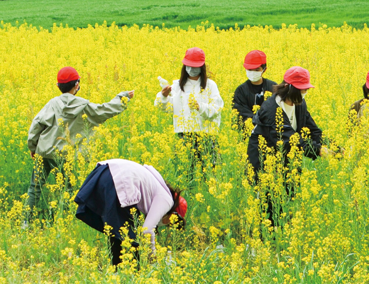 この日は菜の花が開花したことから、当時5年生だった67人が、総合学習の授業の一環として、SDGsの「住み続けられるまちづくりを」などの学習として、花の観察と花摘みを実施。参加した児童は「自分の身長(約140cm)より大きく育っていて驚いた」。「花がきれいで、少し地域に貢献できてうれしかった。これからもSDGsに親しんでいきたい」などと話した。