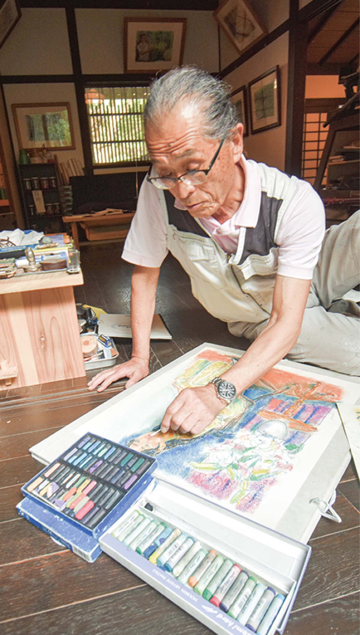 「和田先生とのゆかり、ご縁を無駄にしてはいけない」。依頼を受けて描き続けるテーマは、地元飯山の稲刈りや神社の行事の風景、戸田地区のカーネーションやシクラメン、メロン生産者など。現地で声を聞き、スケッチして持ち帰り、色とりどりのパステルで描きこむ。キャンバスに色を載せた後、指で色をなじませ、柔らかく温もりある表現が持ち味だ。