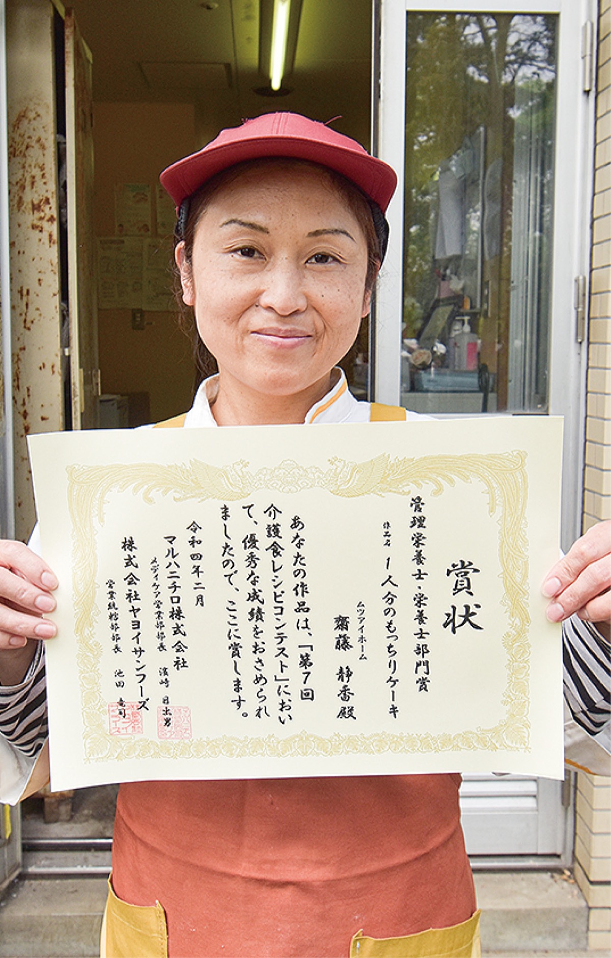 社会福祉法人 厚木慈光会ムツアイホーム(下川入)の給食課で働く齋藤静香さん(46)が、このほど第7回介護食レシピコンテストで「管理栄養士・栄養士部門賞」に選ばれた。