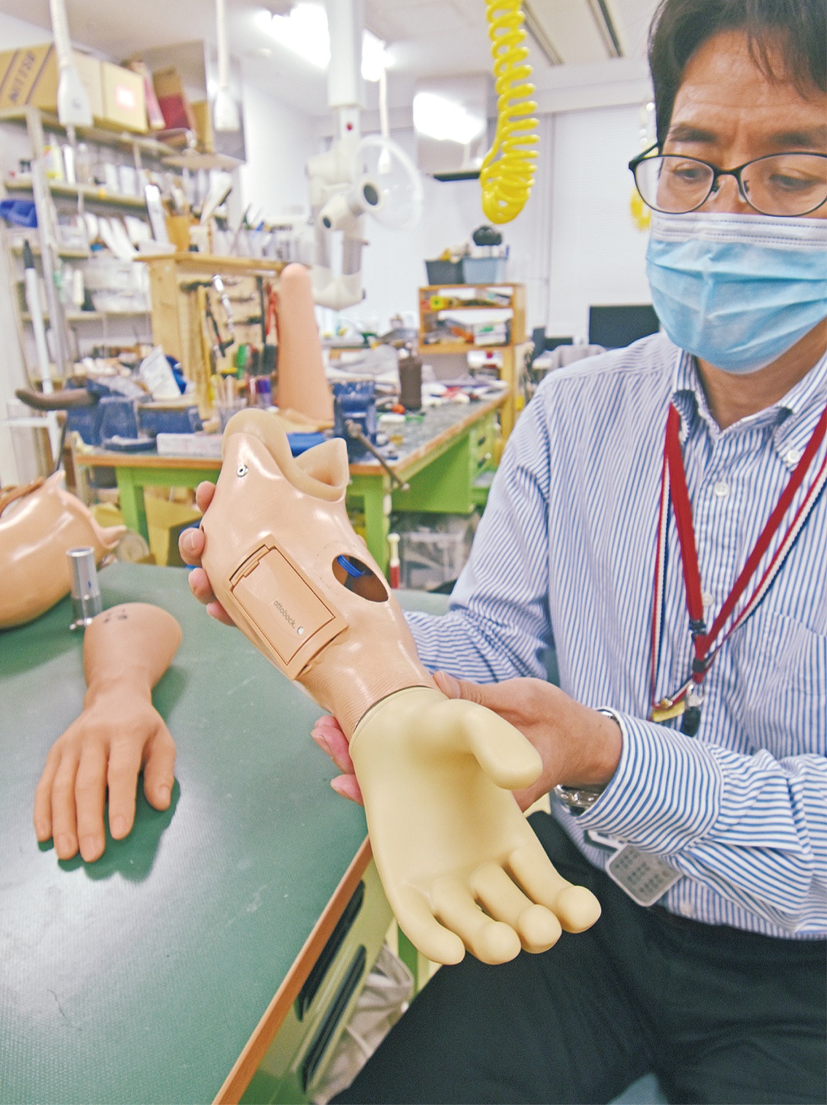 腕を動かす際に筋肉の収縮で生まれる微弱な電気を感知し、掴んだり放すことができる「筋電義手」。生まれつき手がない、もしくは病などで手を失った人の生活を変える義手を普及させるため「未来筋電義手センター」が厚木市七沢の神奈川リハビリテーション病院に発足した。同病院では乳幼児5人を含む10人が通院し、義手の訓練を受けている。