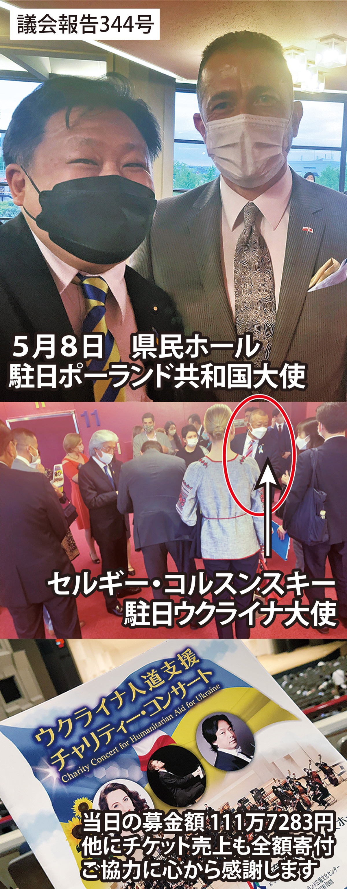 神奈川フィルの演奏でウクライナ出身ソプラノ歌手やポーランド出身のピアニストも御出演頂きました。ウクライナからの避難民も多数招待されウクライナやポーランドの駐日大使の他、大使館関係者も来場されました。