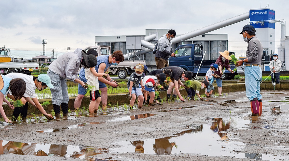 厚木市金田の田んぼで5月14日、田植えが行われ、市内外から多くの親子が参加した。