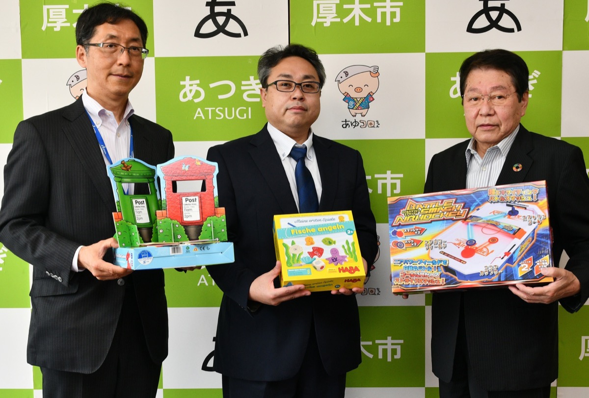 当日は、中央労働金庫厚木支店推進幹事会の堀合純一郎代表推進幹事、同支店の藤原義郎支店長と村木佳史支店長代理が来庁し、小林常良市長に手渡した。小林市長は「子どもたちが楽しく、遊びながら学べる遊具をたくさんいただき、大変ありがたい」とコメントした。