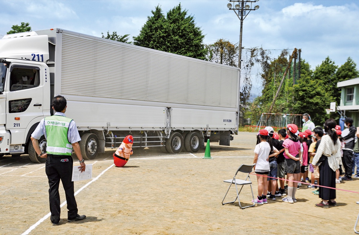 当日は大型トラック7台、関係者22人が参加。トラックの内輪差による巻き込み事故の危険性周知や児童がトラックの運転席に座り、トラックの前に置かれた人形を使い死角があることを伝えた。「ここだと目の前の人形は見えるけど、こっちは見えないよね」とドライバーの1人は児童にトラックには近寄らないように促した。鈴木会長は「お互いが気を付けることで事故が無くなれば」と話した。