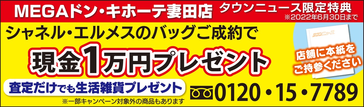 買取専門店「おたからやMEGAドン・キホーテ妻田店」は、6月末までシャネル・エルメスの買取を強化中。バッグの買取成約で現金1万円を進呈しており、スタッフは「古くても壊れていても大丈夫です。この機会にぜひご相談ください」と話す。