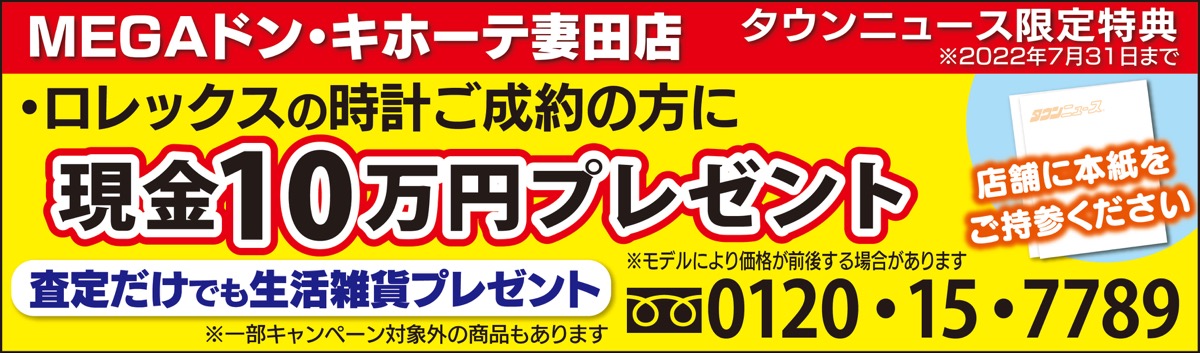 国道246号線沿いにある「ドン・キホーテOUTLET館」2階の買取専門店「おたからやMEGAドン・キホーテ妻田店」では現在、「円安還元キャンペーン」を実施中。腕時計・ロレックスの買取成約で買取金額と別に現金10万円を進呈している。スタッフは「ご好評で多くの相談をいただいています。壊れていても問題ありませんので、この機会にぜひご相談ください」と話す。