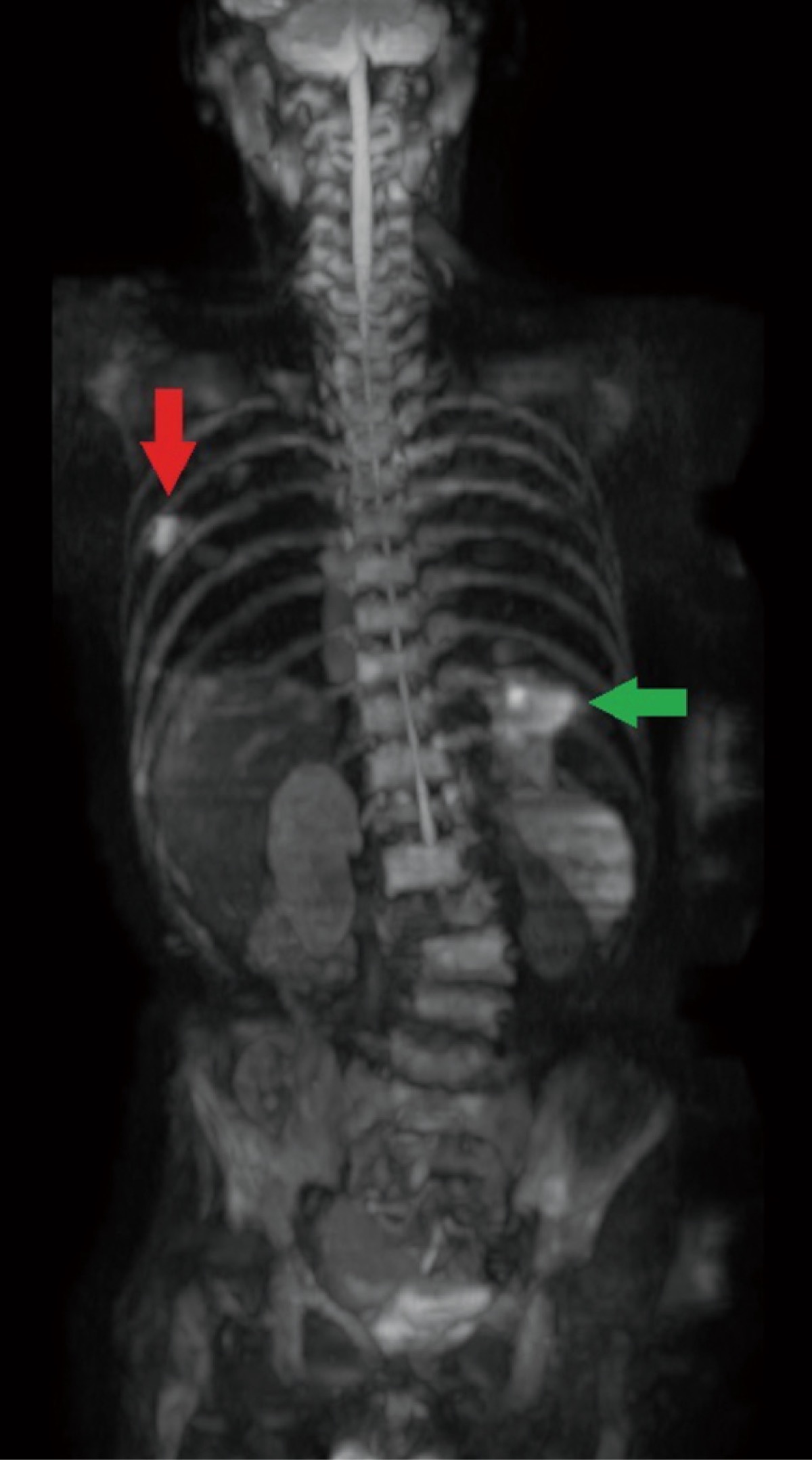 全身のがんの画像検査というとPET検査が有名だが、どのような違いがあるのか。曾根氏は「全身MRI検査は放射線被曝が無く繰り返し行えること、短時間、PET検査に比べ安価であることが特徴です。但しPET検査同様にMRI検査で異常が見つかっても全てが悪性腫瘍ではない所が注意点。左の写真でも左右に集積がありましたが、内視鏡などの追加検査で、赤矢印は肺癌であることがわかり手術、緑矢印は炎症による変化であることがわかりました。この様に見つけるだけの画像検査ではなく精密検査や治療につなげる体制があることが当院の特徴。全身MRI検査を通して質の高い地域医療を目指したい」と話す。