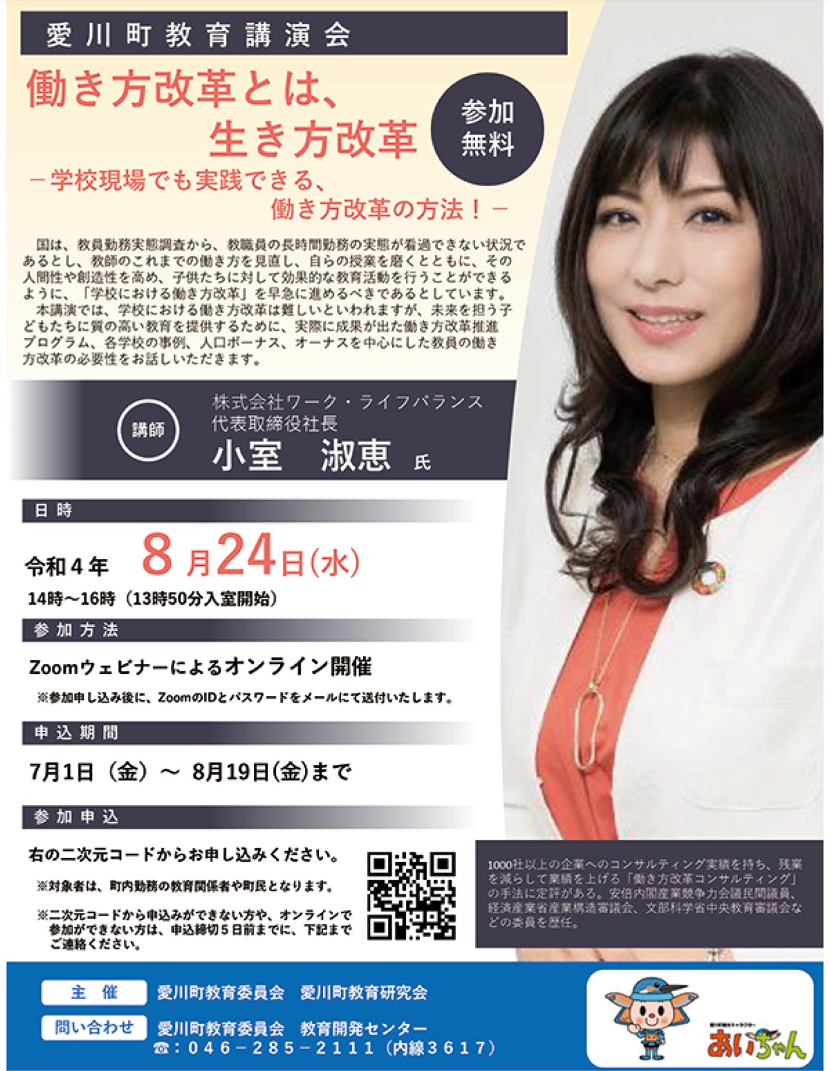 講演テーマは「働き方改革とは、生き方改革-学校現場でも実践できる、働き方改革の方法-」。参加は無料。入室開始は午後1時50分、講演時間は午後2時から4時。参加希望者は、8月19日(金)までに愛川町ホームページ内にある告知PDFの2次元コードから申し込む。