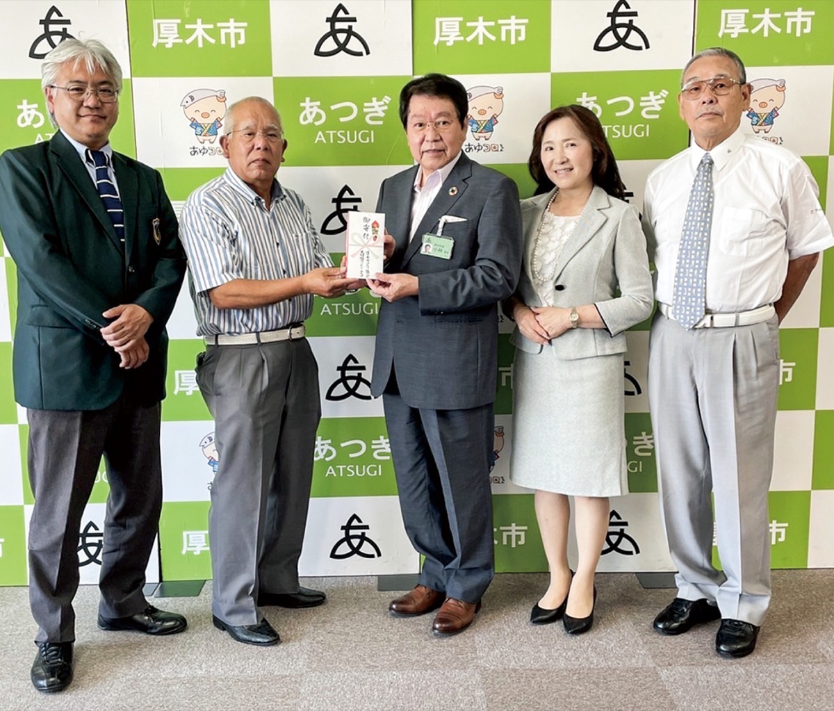 これは、同協会が6月7日に大相模カントリークラブで開催した「厚木市市民ゴルフ大会」でのチャリティの浄財。当日は長澤会長、中村喬副会長、小瀬村寿美子副会長、柿崎哲也大相模カントリークラブ支配人が出席。「スポーツを通じて、厚木市民相互の人間関係の向上と健康増進、スポーツ振興に役立ててほしい」と長澤会長。小林市長は「支援に感謝。日々頑張っている厚木のスポーツ関係に活用していきたい」と話した。