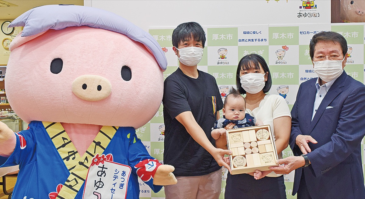 厚木市は、今年4月1日以降に子どもが生まれた家庭を対象に、市内産の間伐材を活用した積み木をプレゼントする事業を本格的にスタートさせた。8月1日には、贈呈式が行われ、3組の親子に小林常良市長から積み木がプレゼントされた。