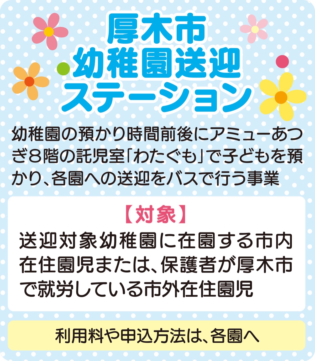 また、希望する施設の種類や年齢などによって、必要な保育料等が異なる。願書提出までに必要な書類を揃えながら、保育料もしっかり確認することが重要。現在は、認定こども園など保育制度の多様化により、共働き家庭でも仕事の状況などによっては保育所だけでなく、幼稚園に預けることができる場合もある。加えて、アミューあつぎ8階の託児室「わたぐも」を活用して幼稚園への送迎を行う「幼稚園送迎ステーション事業」への登録や活用も視野に入れると、選択肢が広がりそうだ。
