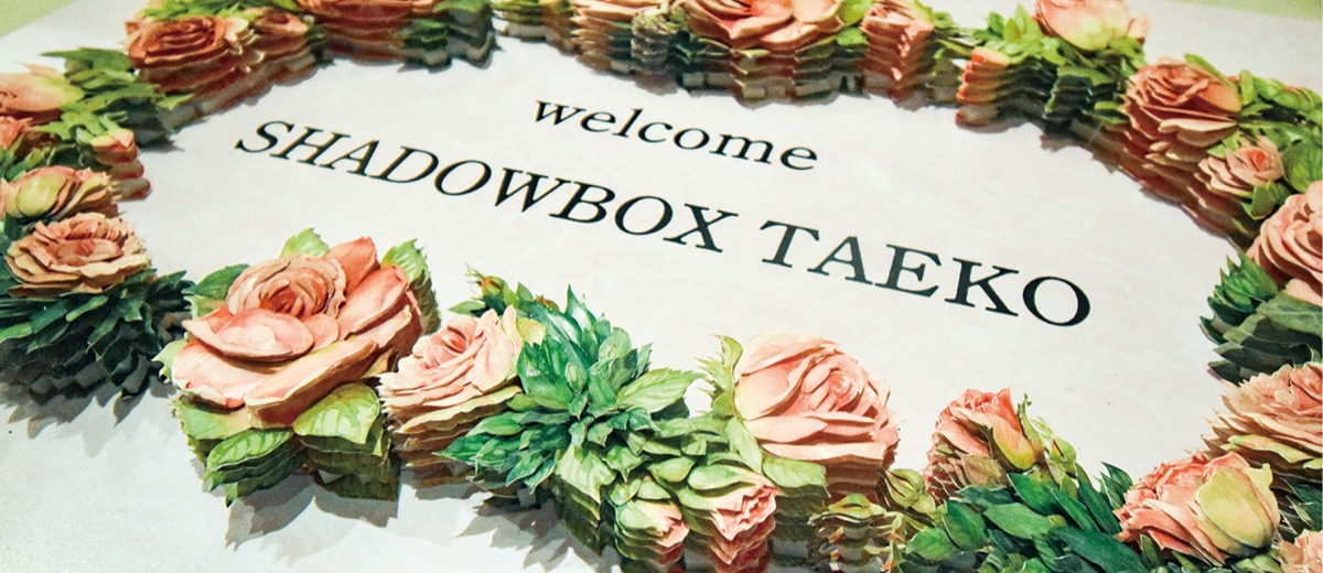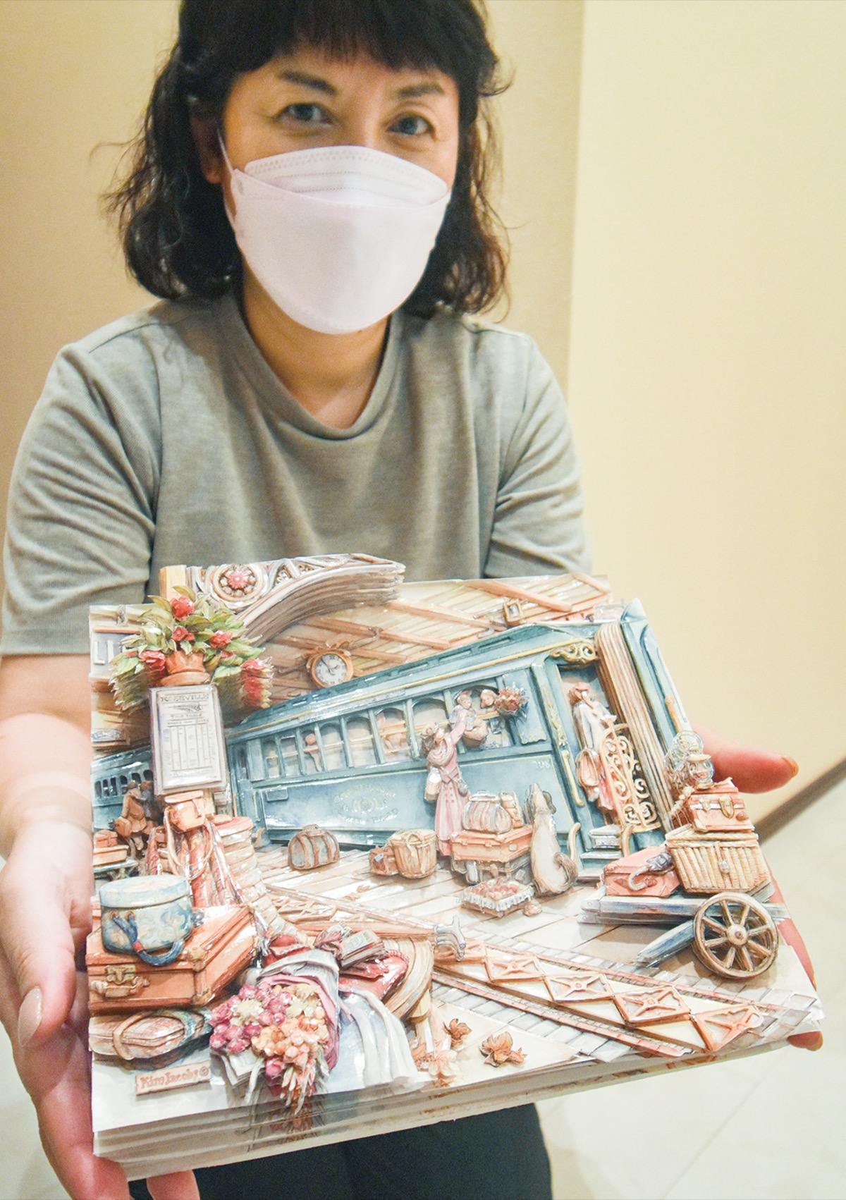 シャドーボックスはヨーロッパ発祥の伝統工芸で、同じ絵柄や形の紙をカッターで切り取り、樹脂などの接着剤で厚みをつけながら、何枚も重ねることで立体感を出してゆく。眺める位置を変えると違った表情に見えるのが面白い。