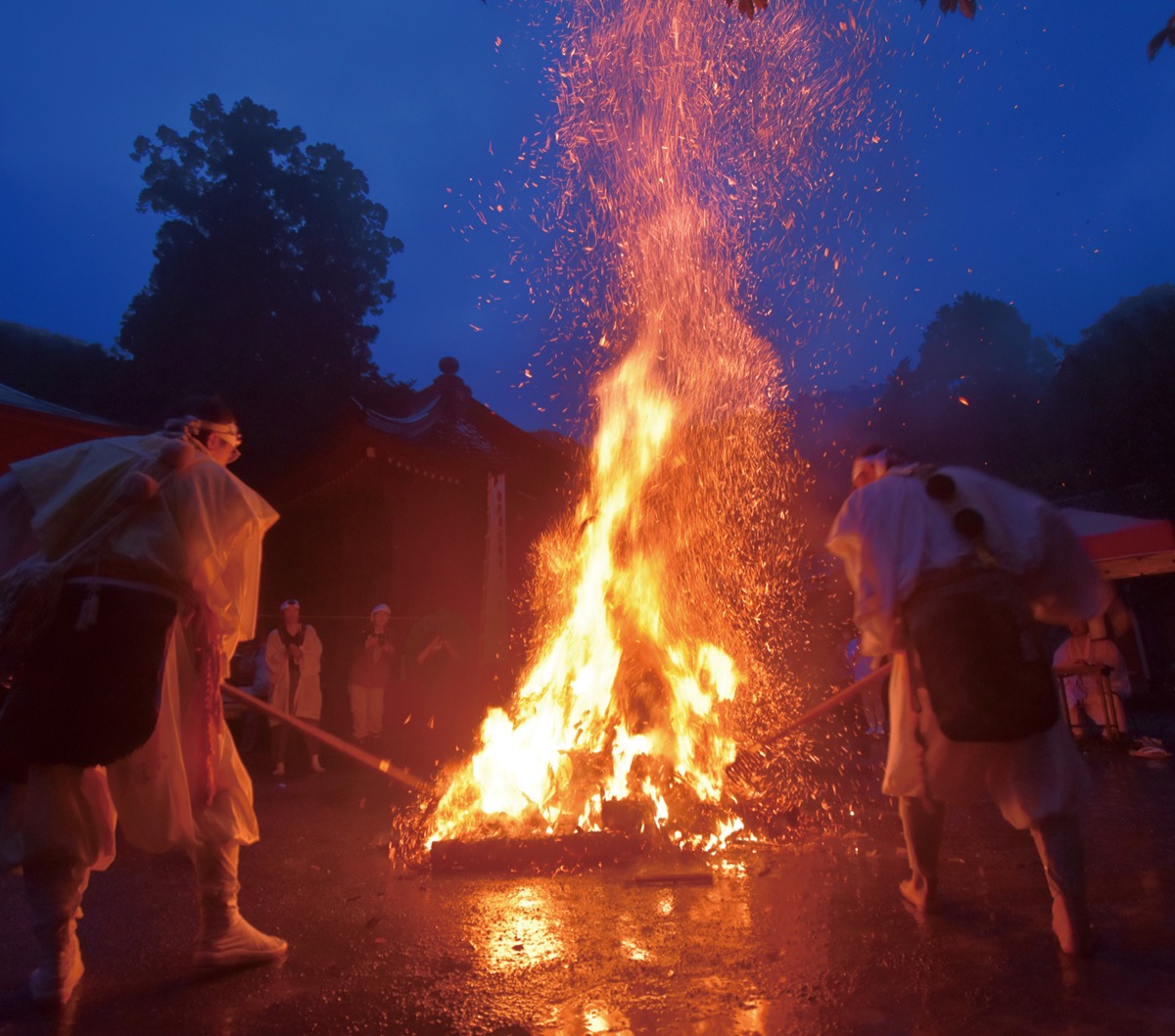 台風を前に雨が降り注いでいたが、修験道の行者たちはものともせず雨天決行。法螺貝を吹きながら境内を巡り、護摩壇を囲み、弓を手に矢を放ったり、刀などを手にして祈る光景も。