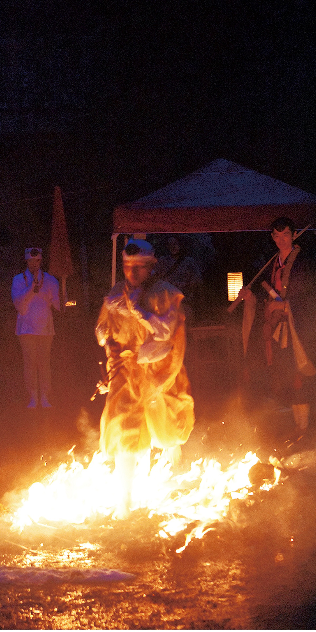 松明は濡れていたが、蝋燭の火を根気よく移すとモクモクと白い煙を吹き出し、炎に包まれた。杉の木を組んだ護摩壇は雨に打たれても火は弱まる気配はない。その後とび口を使って護摩壇をくずし、火の粉を散らしながら炎をならして、林住職や行者たちが次々にその上を歩いた。