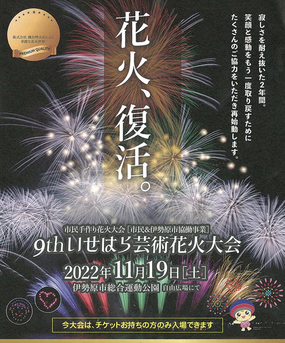 第9回いせはら芸術花火大会が11月19日(土)、伊勢原市総合運動公園自由広場で午後6時から開催される。