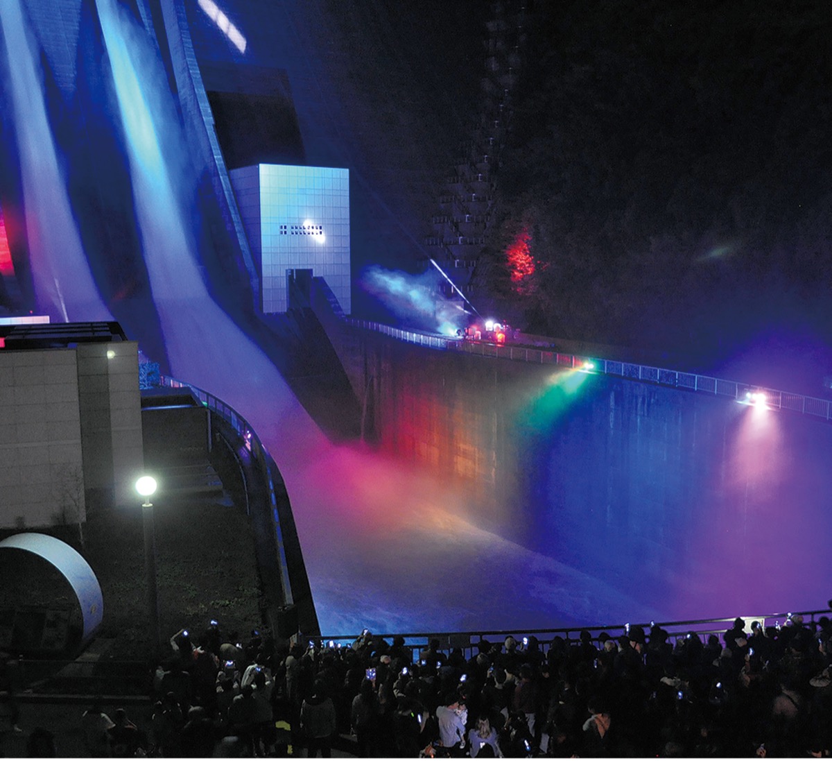 ナイト放流は、ライトアップされた幻想的な雰囲気の中、宮ヶ瀬ダムのダイナミックな放流を楽しむことができるもの。全国的にも珍しい夜間の観光放流を、一目見ようと全国各地から訪れるほど人気の観光イベントとして定着している。