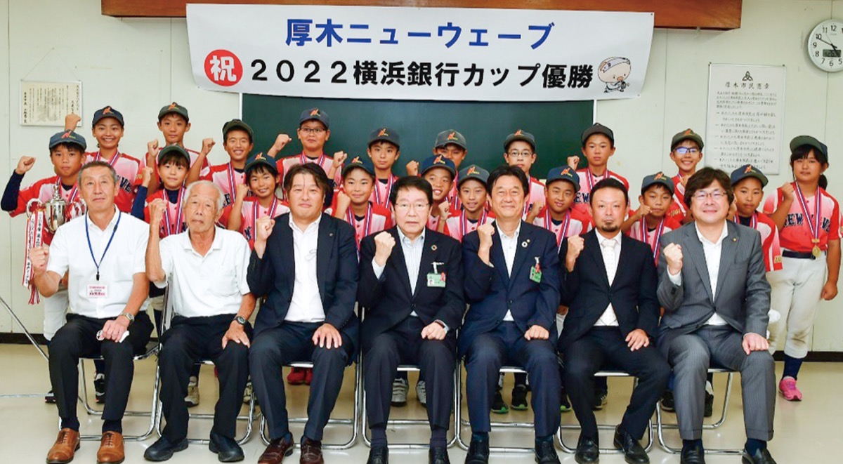 8月下旬から9月上旬にかけて大和スタジアムほかで行われた「2022横浜銀行カップ神奈川県学童軟式野球選手権大会」(神奈川県少年野球連盟学童部ほか主催)で優勝した少年軟式野球チーム「厚木ニューウェーブ」(菊池岳監督)の部員らが9月26日、小林常良厚木市長に優勝を報告した。同大会は県内各市町からの代表や県大会で優勝・準優勝した43チームが参加し行われた。