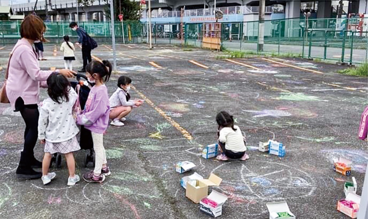 当日はサンパークでステージ&マルシェが行われたほか、サンパーク横にある市の複合施設建設予定地が開放され、「お絵描きコーナー」も開設された。ここでは厚木小学校から使えなくなった小さなチョークなどが提供され、親子連れなどが空き地いっぱいで、普段はできないお絵描きを楽しんだ。