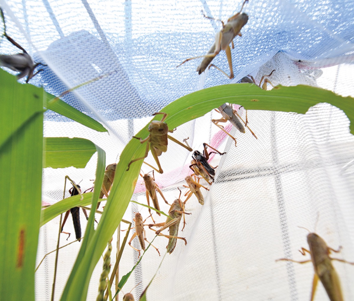 バッタは牧草のような爽やかな香りとエビのような風味を合わせた味が特長。焼いたり揚げたりすると、茶やノリのような風味になり、色は赤く変わる。ネットの中のバッタは白っぽい色で、弘前大から分けてもらった養殖に適した系統だ。1カ月半ほどで「収穫」でき、成虫が産んだ卵からまた成虫へと育てる。