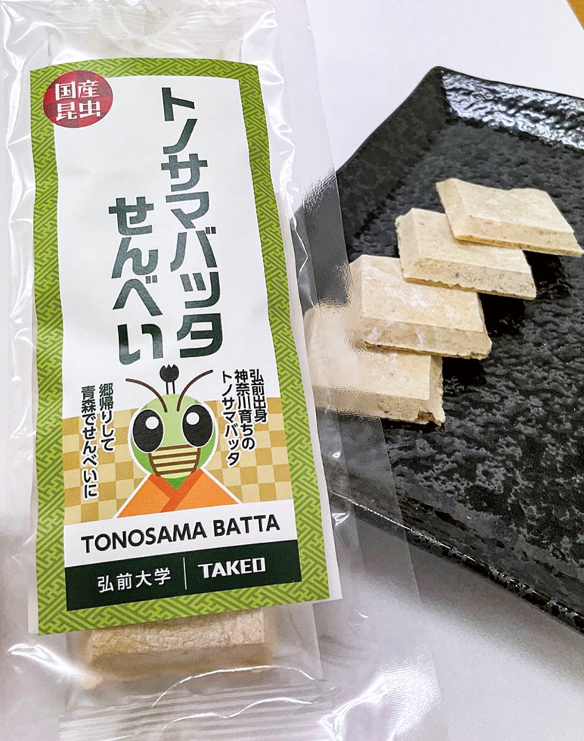 収穫したバッタは伊勢原市内で粉末に加工し、青森県で「トノサマバッタせんべい」に焼き上げる。記者が試食すると、サクサクとした食感で、ほんのり草が香った。今年6月からの試験販売(4枚入り390円)ではアミューあつぎ内「あつまる」などで販売され、すぐに売り切れた。まだバッタが大量生産に至っていない事もあり、今は在庫がないという。