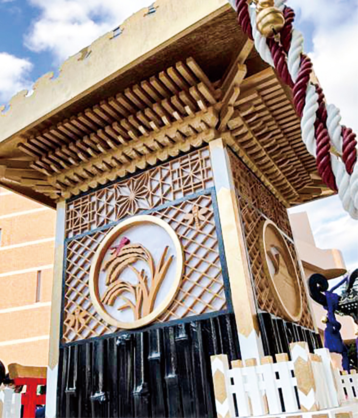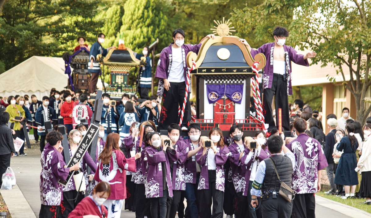 学生会館前には個性的な神輿4基が登場。農学科、動物科学科、生物資源開発学科、デザイン農学科の4学科ごとに、例年新しい神輿を制作している。今年は夏ごろから作り始め、学科にちなんだ牛の顔や米俵、大根などの装飾をあしらった神輿が完成した。一部は内側に仕込んだライトで幻想的に浮かび上がるこだわりの作品も。