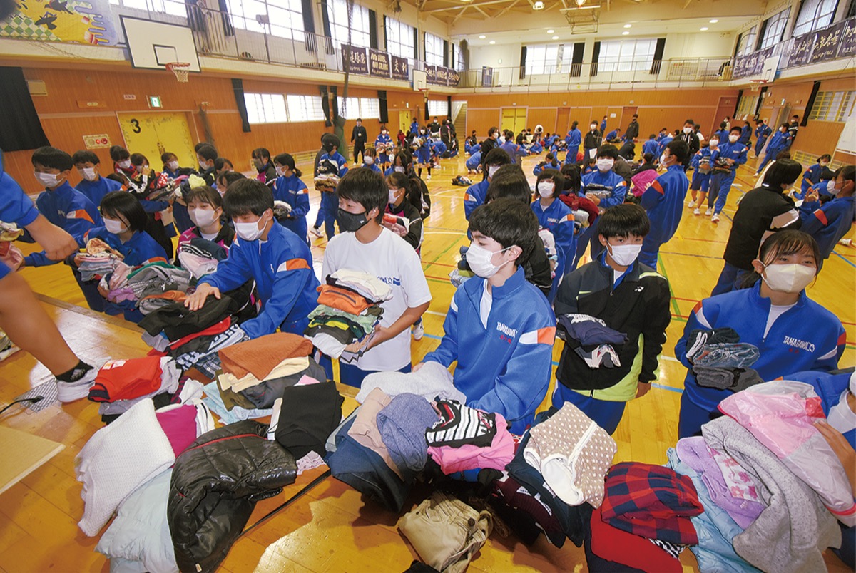 玉川中学校で11月21日、体育館に大量の服が集まった。ユニクロやGUが実施している「届けよう服のチカラプロジェクト」の一環で、同中学校も9月から市内の公民館や学校に協力してもらい、複数の回収箱を置いていた。