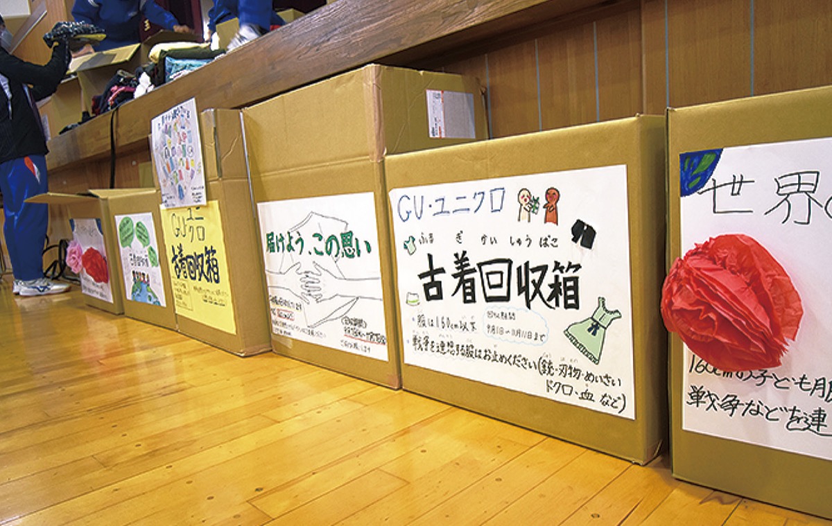 玉川中学校では生徒会などによるエコキャップ運動が続けられ、授業でもSDGsについて学んできた。今年春頃に保護者からプロジェクトの情報が寄せられ、生徒会や教職員が意気投合し、参加を申請。7月にはGUの伊勢原店の関係者による出張授業も実現した。夏休み明けから活動は本格化。生徒たちは自力でプロジェクトについてのホームページを立ち上げたほか、箱や手描きポスターを作り、南毛利公民館や玉川公民館、毛利台小学校に設置された。
