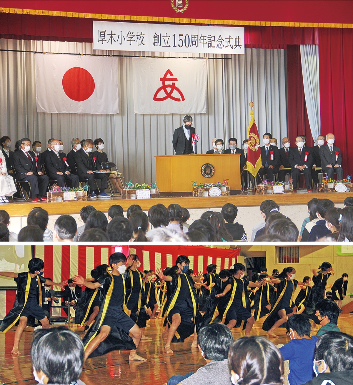 今年度創立150年を迎えた厚木市立厚木小学校(小林正徳校長/寿町)。これまでに様々な記念事業が実施され、11月18日にはその集大成となる創立150周年記念式典を同校体育館で開催した。当日は6年生以外は各教室からオンラインで参加。式典後には6年生によるソーラン節の演舞が披露されたほか、学校ベスト10なども発表された。