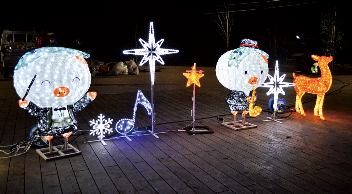 時間は毎日午後5時から8時まで。あゆコロちゃんをはじめ、ツリーやハートなどカラフルで賑やかなイルミネーションとなっている。夜の静かな園内は散歩やランニングを楽しむ人も多く、イルミネーションの前で足を止める人の姿も。